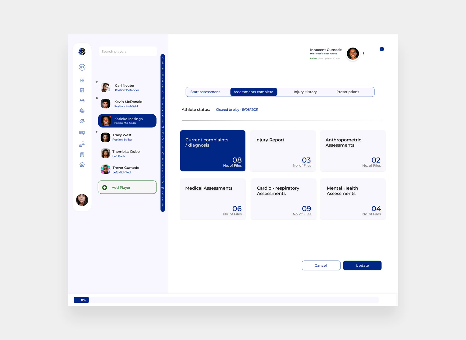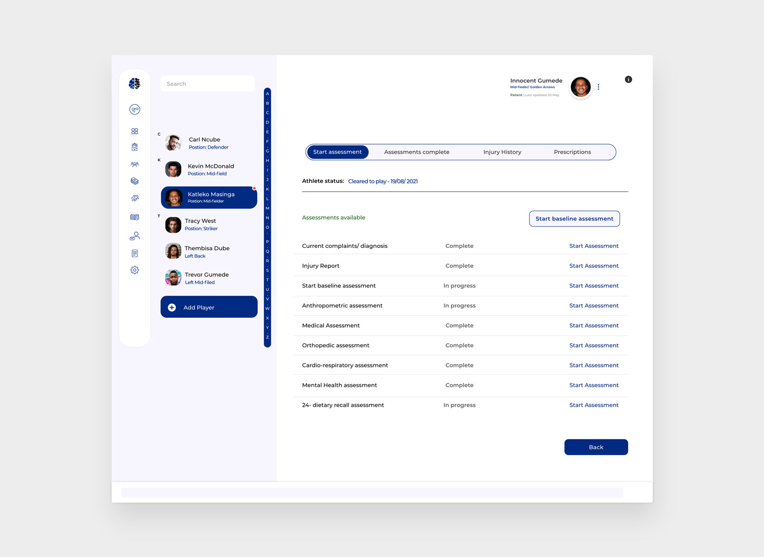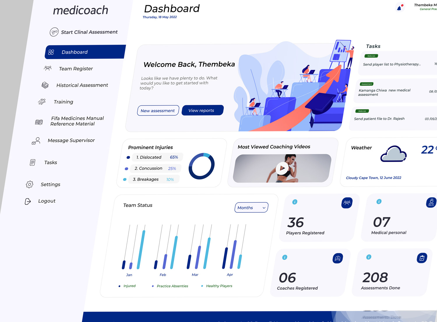 Home About Work Research Contact Medicoach Cutting-edge software technology born from academic research aims to understand the best-in-class methodologies to prevent, manage, and predict injury. The platform captures the latest, world-leading clinical assessment screening tools to identify players at risk of injury and provide coaches with the tools to implement preventative interventions to keep the squad healthy through the season. Research - Design - Medical equipment - Development - Financing - Prototyping The benefits + Clinically developed screening assessments; + Improved injury prevention processes + Best in class return to play protocols + Latest practice drills, fitness tests, and simulation techniques + Improved communication with local clinicians to improve clinical services Developed for coaches The platform is designed to provide coaches with the best-in-class tools to improve their knowledge, practices, and career opportunities within their sport. We understand the pressures coaches face, and Medicoach provides digital resources, and support to bring out the best in their players. Our drill bank of warm-ups, fitness tests, and skill sessions gives the coach resources and tools to be a world-leading coach. Back to work next project ©Rorscachinnovationservices/All Rights Reseverved. Back to top